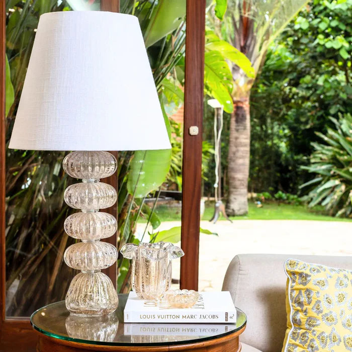 O Abajur Murano Crystal White é uma peça de iluminação que une sofisticação e exclusividade. Produzido em vidro soprado artesanalmente, sua base apresenta formas orgânicas e elegantes, com esferas texturizadas em tom de branco translúcido que criam um efeito refinado e atemporal.