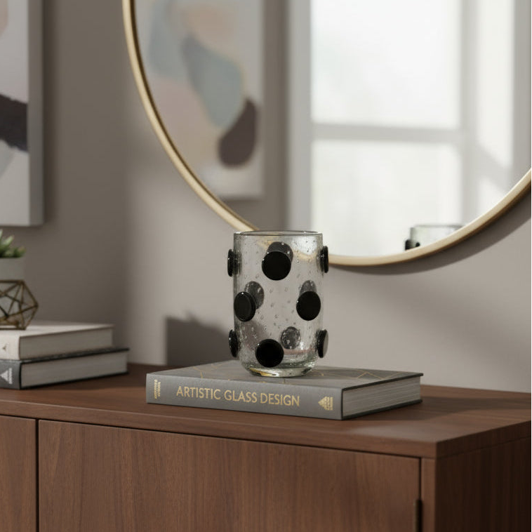 O Vaso Murano Dots une transparência com textura e aplicações circulares em preto para criar uma peça de impacto que funciona tanto com arranjos florais quanto como escultura de mesa. O efeito de bolhas no vidro adiciona profundidade e refração de luz, enquanto os “dots” em relevo trazem um gesto contemporâneo que conversa com composições minimalistas e P&B.