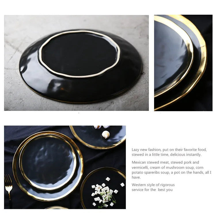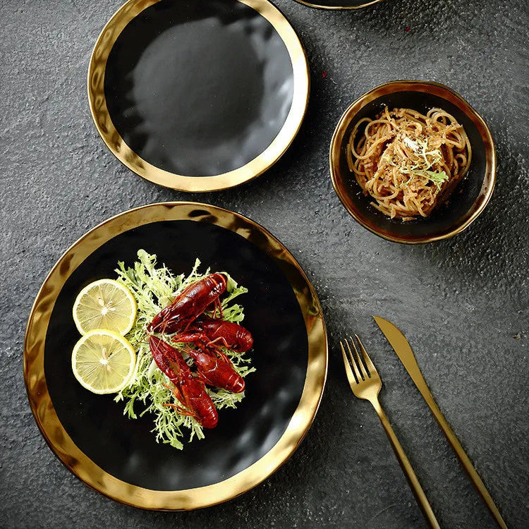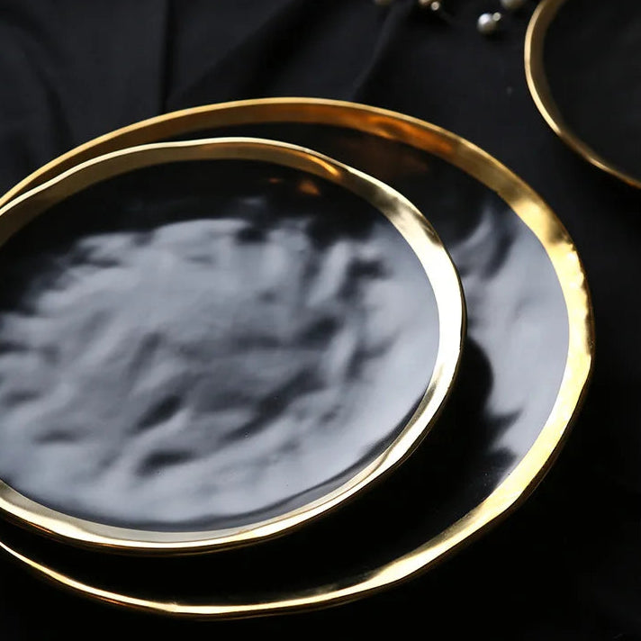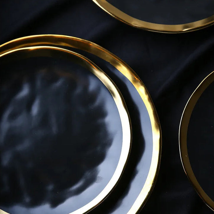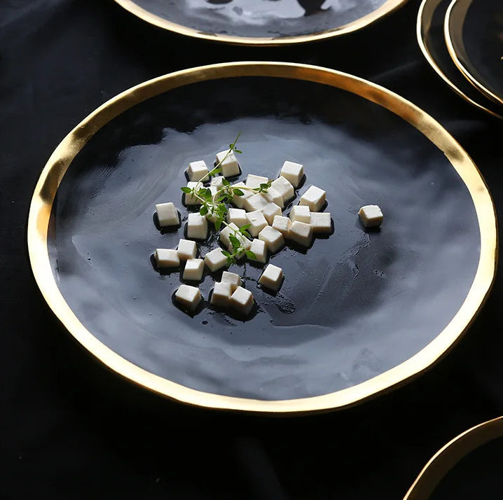 Tags: prato preto dourado, prato orgânico, mesa posta sofisticada, cerâmica com dourado, prato de serviço, decoração de mesa