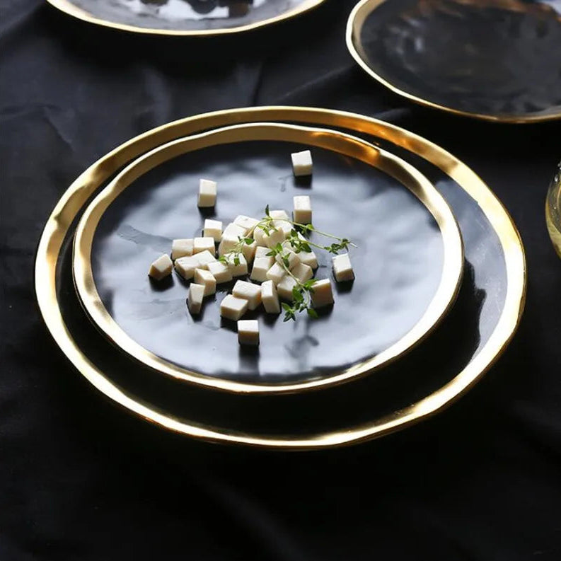 O Prato Orgânico Edge Gold combina superfície em tom escuro com acabamento levemente texturizado e uma borda dourada fluida que contorna a peça de maneira artesanal. O contraste entre o preto profundo e o brilho metálico cria uma presença elegante que valoriza composições minimalistas, contemporâneas e de inspiração gastronômica.